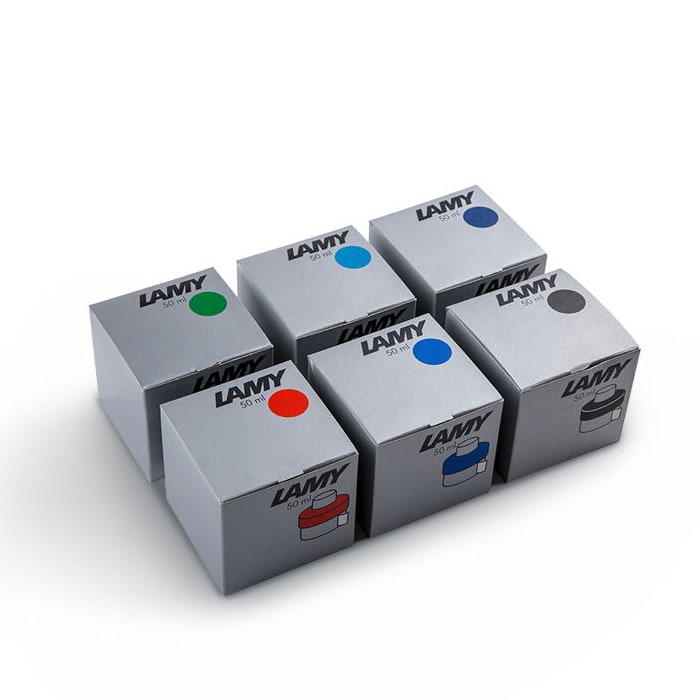 LAMY T 52 bottled ink, 50ml, comes with an in-built roll of blotting paper around the base and ink residue collecting basin for effortless and mess-free refilling of your fountain pen. All T52 ink bottles include a bottler tape which can be used to clean the pen after every refill. Available in a variety of colours and specifically engineered to suit LAMY fountain pens.