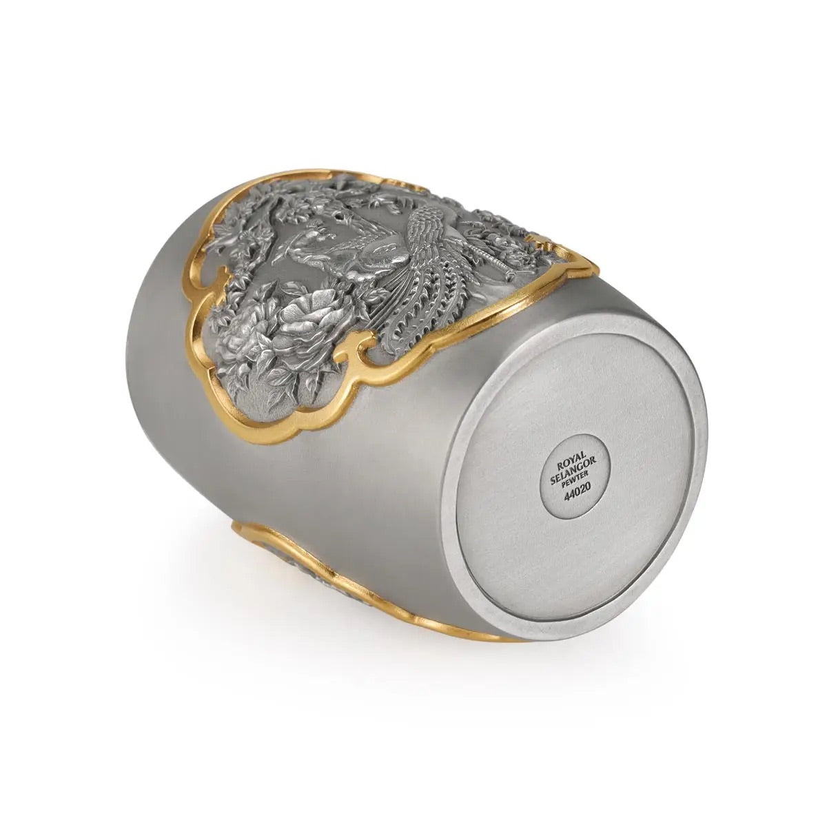 This is the Royal Selangor Straits Expression - Peacock & Phoenix Travel Caddy. This perfectly sized pewter caddy, with specific dimensions of H9.4cm x 7cm x 7cm, is not just a travel companion but a piece of art that combines history and elegance.