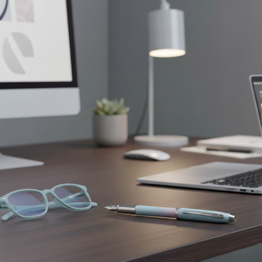 A stylish fountain pen with a blue and pink pearlised gradient finish and chrome-plated trims. Medium nib for smooth, reliable writing—perfect for everyday use or gifting.