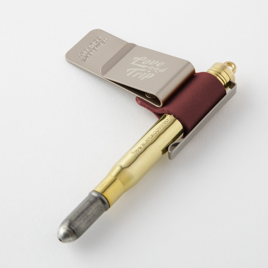 The clip features a laser-engraved "LOVE AND TRIP" design, adding a meaningful touch while ensuring your pen stays securely in place. Whether you're capturing memories on the go or journaling at home, this durable and stylish holder keeps your writing instrument within reach.