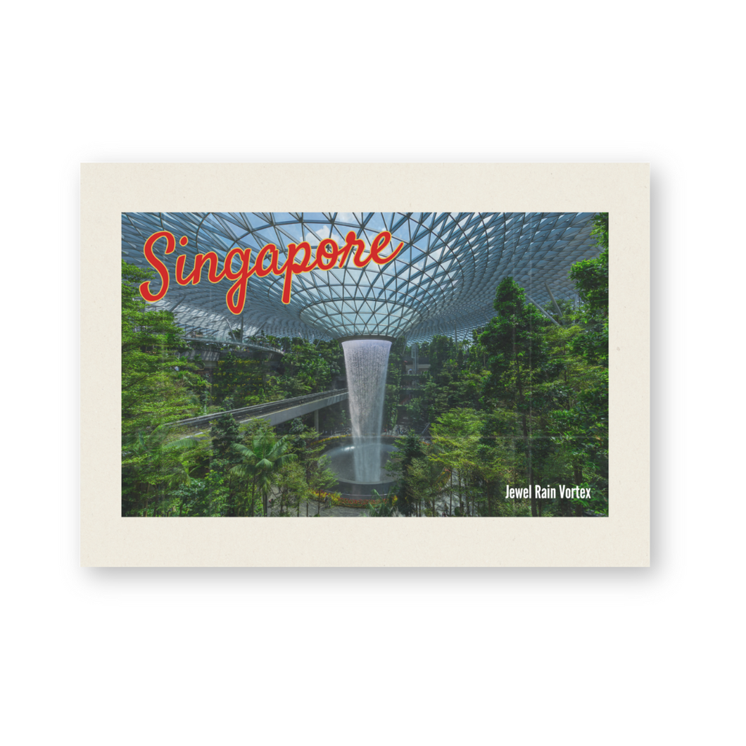 Transport yourself to the heart of Singapore with our Vintage Jewel Vortex postcard, showcasing the stunning Jewel Rain Vortex located at Changi Airport. This breathtaking scene captures the beauty of the world's tallest indoor waterfall surrounded by lush greenery, set beneath the impressive glass dome structure of Jewel. A perfect way to remember the vibrance of Singapore, this vintage-style postcard brings a piece of Singapore’s architectural and natural wonders to life.