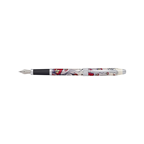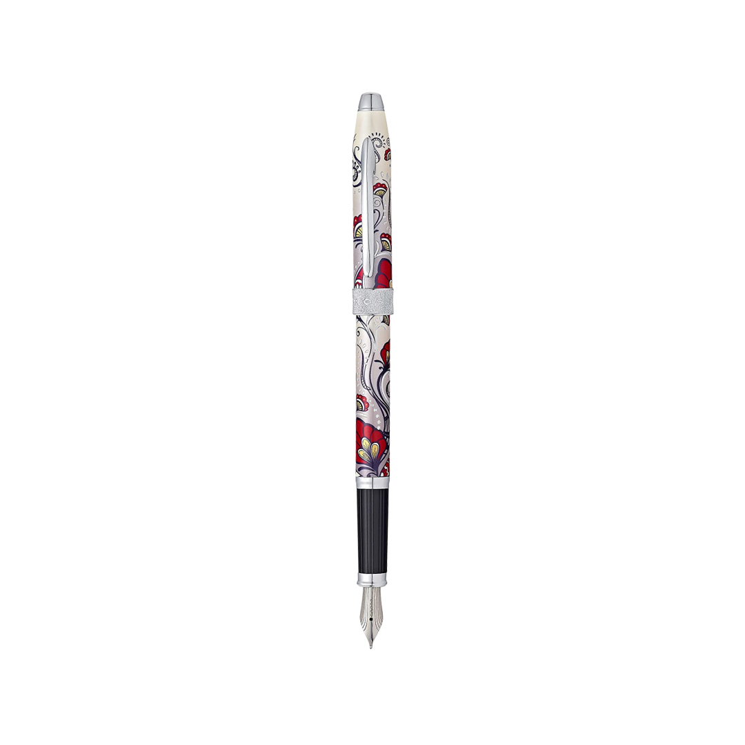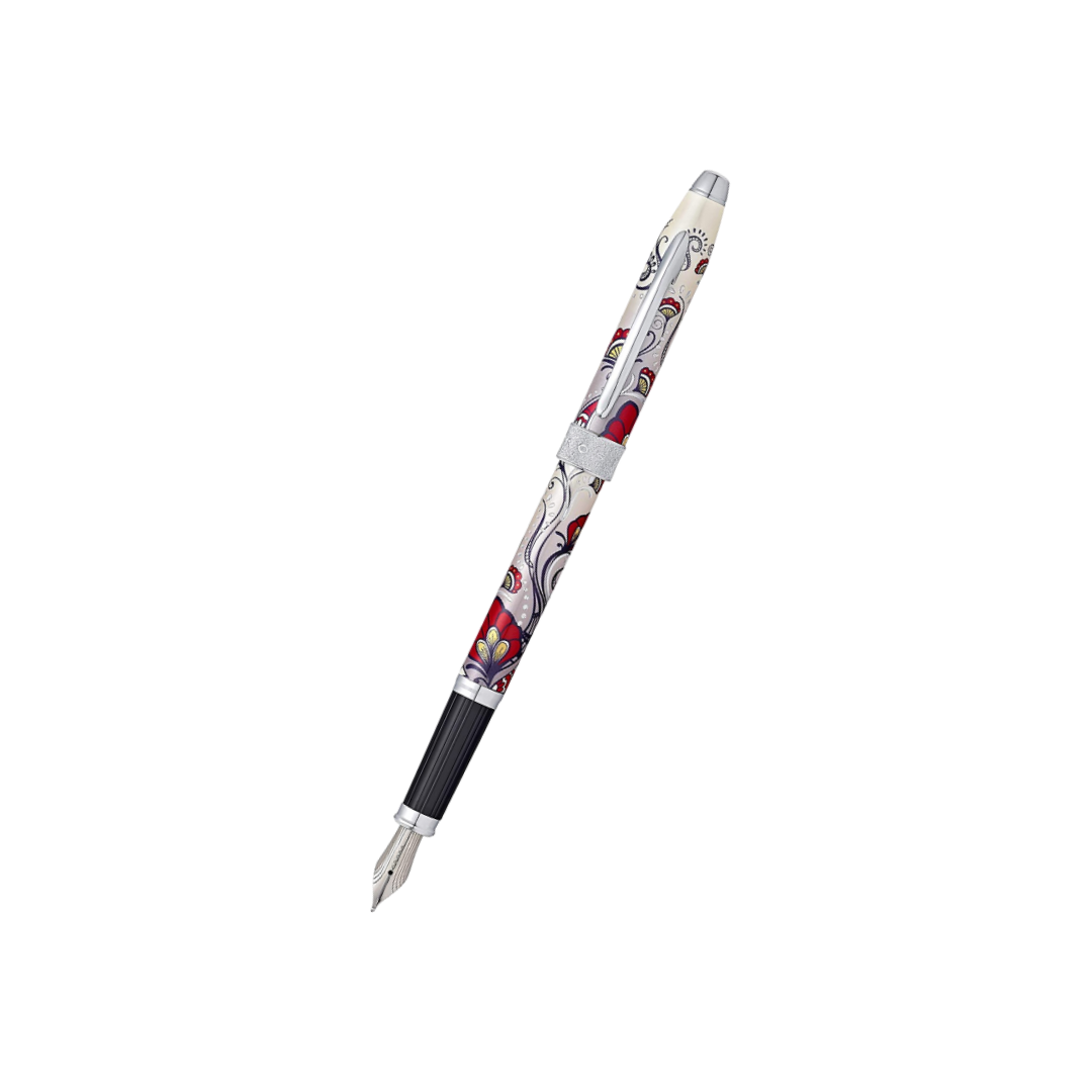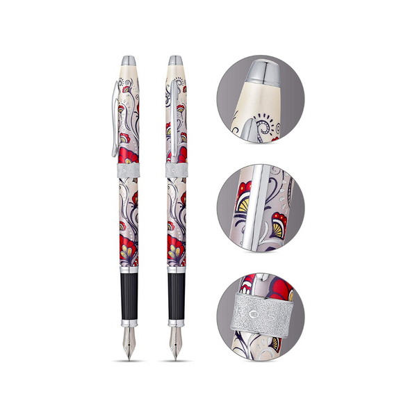 The brilliant flower patterns are printed over an ivory metallic lacquer base, with unique print process and enhanced with accents of silvery chrome or brilliant gold plated deep cut engraving that adds intrigue, depth and dimension
