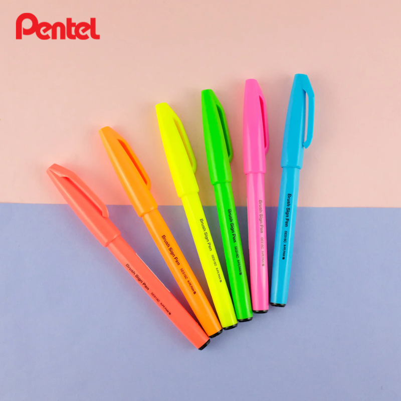 Pentel Brush Sign Pen - Fluorescent Set (Red, Orange, Yellow, Green, Pink, & Blue)